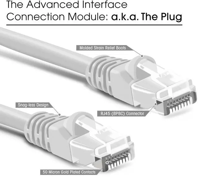 • UTP 24AWG stranded conductors for flexibility, twisted in pairs and nested in a spline to minimize crosstalk, 50 micron gold-plated contacts for high-speed data transfer and corrosion resistance, as well as molded, snag-less strain relief boots for long lasting, durable connections