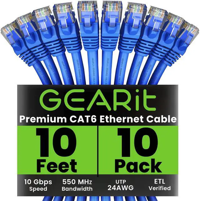 GearIT Cat 6 Ethernet Cable (10-Pack 10 Feet) Cat6 Network Patch, 10Gbps, RJ45, Snagless Cord, Gold-Plated Connectors, Internet for PC, TV, Tablet, Router, Printer, Servers, IT Data Center - Blue