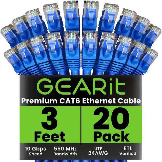 GearIT Cat 6 Ethernet Cable (20-Pack 3 Feet) Cat6 Network Patch, 10Gbps, RJ45, Snagless Cord, Gold-Plated Connectors, Internet for PC, TV, Tablet, Router, Printer, Servers, IT Data Center - Blue