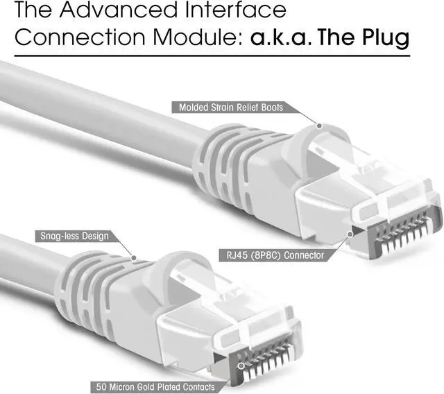 UTP 24AWG stranded conductors for flexibility, twisted in pairs and nested in a spline to minimize crosstalk, 50 micron gold-plated contacts for high-speed data transfer and corrosion resistance, as well as molded, snag-less strain relief boots for long lasting, durable connections