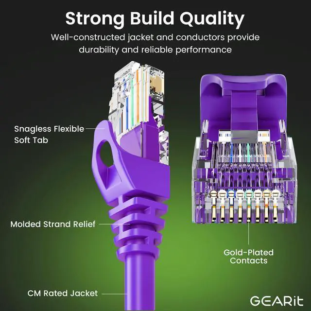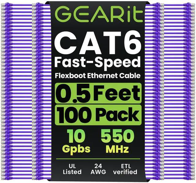 Future-proof your network for 10-Gigabit Ethernet with GEARit Cat 6 Network Patch Cables. With GEARit Cat6 cables, your network will be ready for the future and will still be working when you get there. Industry standard ANSI/TIA-568-C. 2, Cat 6, ETL verified cables with high compliance RJ45 (8P8C) snag-less connectors and molded strain relief boots. Bandwidth rating of up to 550 Mhz ensures compatibility with Ethernet 10BASE-T, 100BASE-TX (Fast Ethernet), 1000BASE-T (Gigabit Ethernet), 10GBASE-T (10-Gigabit Ethernet), Peer-to-Peer, and any other applications that utilize networking cables including telephony, home automation and long distance video transfer technologies like HMDI over Ethernet.