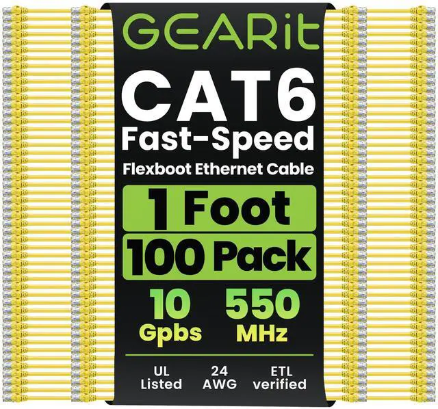 Future-proof your network for 10-Gigabit Ethernet with GEARit Cat 6 Network Patch Cables. With GEARit Cat6 cables, your network will be ready for the future and will still be working when you get there. Industry standard ANSI/TIA-568-C. 2, Cat 6, ETL verified cables with high compliance RJ45 (8P8C) snag-less connectors and molded strain relief boots. Bandwidth rating of up to 550 Mhz ensures compatibility with Ethernet 10BASE-T, 100BASE-TX (Fast Ethernet), 1000BASE-T (Gigabit Ethernet), 10GBASE-T (10-Gigabit Ethernet), Peer-to-Peer, and any other applications that utilize networking cables including telephony, home automation and long distance video transfer technologies like HMDI over Ethernet.