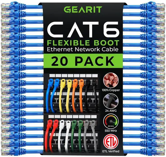 Future-proof your network for 10-Gigabit Ethernet with GEARit Cat 6 Network Patch Cables. With GEARit Cat6 cables, your network will be ready for the future and will still be working when you get there. Industry standard ANSI/TIA-568-C. 2, Cat 6, ETL verified cables with high compliance RJ45 (8P8C) snag-less connectors and molded strain relief boots. Bandwidth rating of up to 550 Mhz ensures compatibility with Ethernet 10BASE-T, 100BASE-TX (Fast Ethernet), 1000BASE-T (Gigabit Ethernet), 10GBASE-T (10-Gigabit Ethernet), Peer-to-Peer, and any other applications that utilize networking cables including telephony, home automation and long distance video transfer technologies like HMDI over Ethernet.