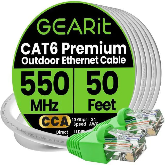 Just dig a trench, bury the cable and you're done. ^^ Copper Clad Aluminum for Quality and Value - This outdoor Ethernet cable offers Cat6 speeds up to 10 Gbps and 550 MHz while remaining affordable, with four twisted pairs of high-quality copper clad aluminum (CCA) wire for a consistent, clean connection over any distance. That means reliable networking for your home or business, minus the unnecessary cost. ^^ RJ45 Connectors With Bubble Boots - The gold-plated RJ45 connectors on this outdoor Ethernet cable are wrapped with flexible PVC "bubble boot" covers.