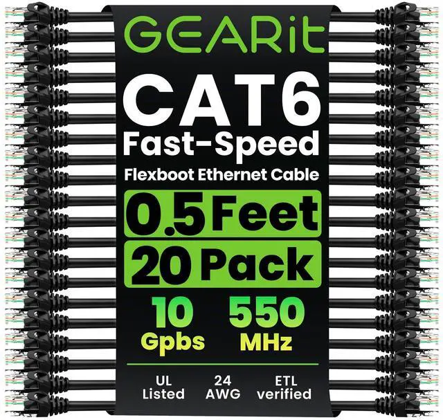 GEARit 20-Pack Cat6 Patch Cable 0.5 Foot / 6 Inches Cat 6 Ethernet Cable Snagless Flexible Soft Tab - Premium Series - Black