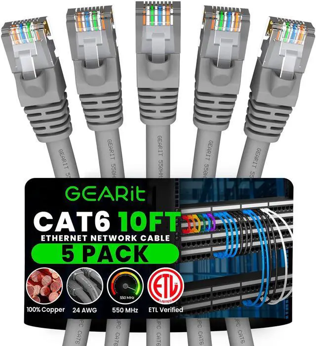 GEARit Cat6 Ethernet Cables (5-Pack) - Available in multiple lengths and colors, these high-quality Cat6 Ethernet patch cables excel at networking applications where high-speed connections are essential. With ETL-verified durability, RJ45 bubble boot connectors and gold-plated contacts, these handy multi-packs combine excellent quality and value. ^^ Cat6 Cables With 24 AWG Conductors - The Ethernet cables in these multi-packs feature stranded conductor wire at a thickness of 24 AWG (American Wire Gauge), wrapped with isolating material and terminated with gold-plated contacts, ensuring consistent electrical current for high-speed data transfer up to blazing Category 6 Ethernet speeds.