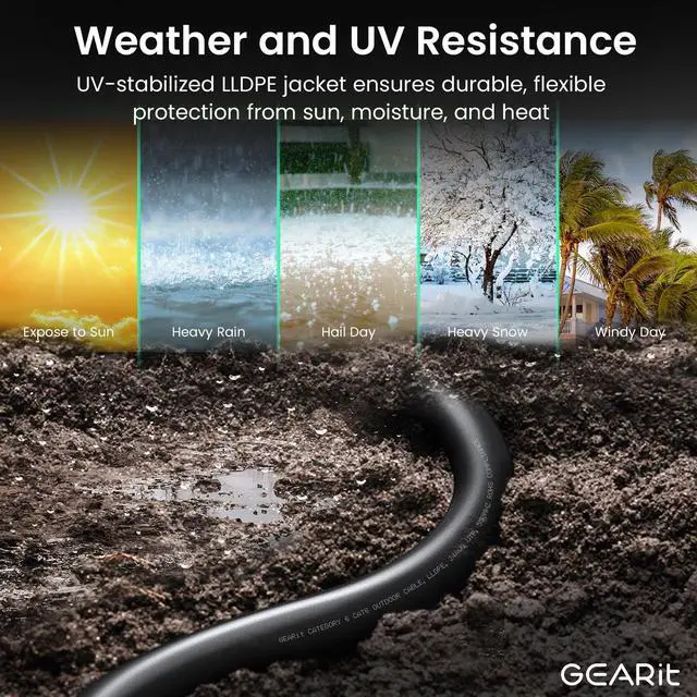 GEARit Outdoor Ethernet Cable - This direct burial Cat6 cable combines ruggedness, blazing speed and impressive value to create the perfect Ethernet networking solution for your outdoor router, backyard office, permanent or temporary outdoor installation, or anywhere you need a reliable network connection that can stand up to weather and harsh conditions. ^^ Direct Burial Cat6 Cable - This outdoor Ethernet cable features a durable jacket rated for direct burial. Avoid ugly cable runs and tripping hazards by keeping your connections underground. It's easy to install for homeowners, professional contractors and IT professionals alike, without need for conduits or extra gear.