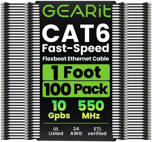Future-proof your network for 10-Gigabit Ethernet with GEARit Cat 6 Network Patch Cables. With GEARit Cat6 cables, your network will be ready for the future and will still be working when you get there. Industry standard ANSI/TIA-568-C. 2, Cat 6, ETL verified cables with high compliance RJ45 (8P8C) snag-less connectors and molded strain relief boots. Bandwidth rating of up to 550 Mhz ensures compatibility with Ethernet 10BASE-T, 100BASE-TX (Fast Ethernet), 1000BASE-T (Gigabit Ethernet), 10GBASE-T (10-Gigabit Ethernet), Peer-to-Peer, and any other applications that utilize networking cables including telephony, home automation and long distance video transfer technologies like HMDI over Ethernet.