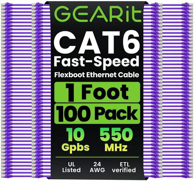 Future-proof your network for 10-Gigabit Ethernet with GEARit Cat 6 Network Patch Cables. With GEARit Cat6 cables, your network will be ready for the future and will still be working when you get there. Industry standard ANSI/TIA-568-C. 2, Cat 6, ETL verified cables with high compliance RJ45 (8P8C) snag-less connectors and molded strain relief boots. Bandwidth rating of up to 550 Mhz ensures compatibility with Ethernet 10BASE-T, 100BASE-TX (Fast Ethernet), 1000BASE-T (Gigabit Ethernet), 10GBASE-T (10-Gigabit Ethernet), Peer-to-Peer, and any other applications that utilize networking cables including telephony, home automation and long distance video transfer technologies like HMDI over Ethernet.