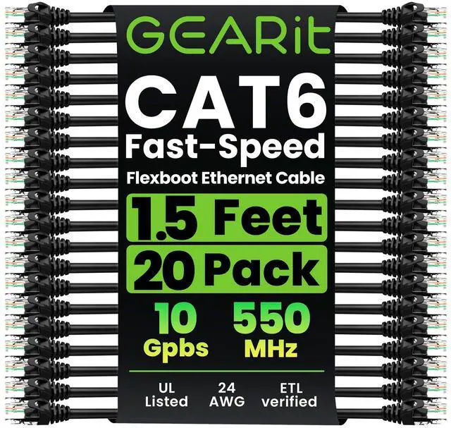 Future-proof your network for 10-Gigabit Ethernet with GEARit Cat 6 Network Patch Cables. With GEARit Cat6 cables, your network will be ready for the future and will still be working when you get there. Industry standard ANSI/TIA-568-C. 2, Cat 6, ETL verified cables with high compliance RJ45 (8P8C) snag-less connectors and molded strain relief boots. Bandwidth rating of up to 550 Mhz ensures compatibility with Ethernet 10BASE-T, 100BASE-TX (Fast Ethernet), 1000BASE-T (Gigabit Ethernet), 10GBASE-T (10-Gigabit Ethernet), Peer-to-Peer, and any other applications that utilize networking cables including telephony, home automation and long distance video transfer technologies like HMDI over Ethernet.