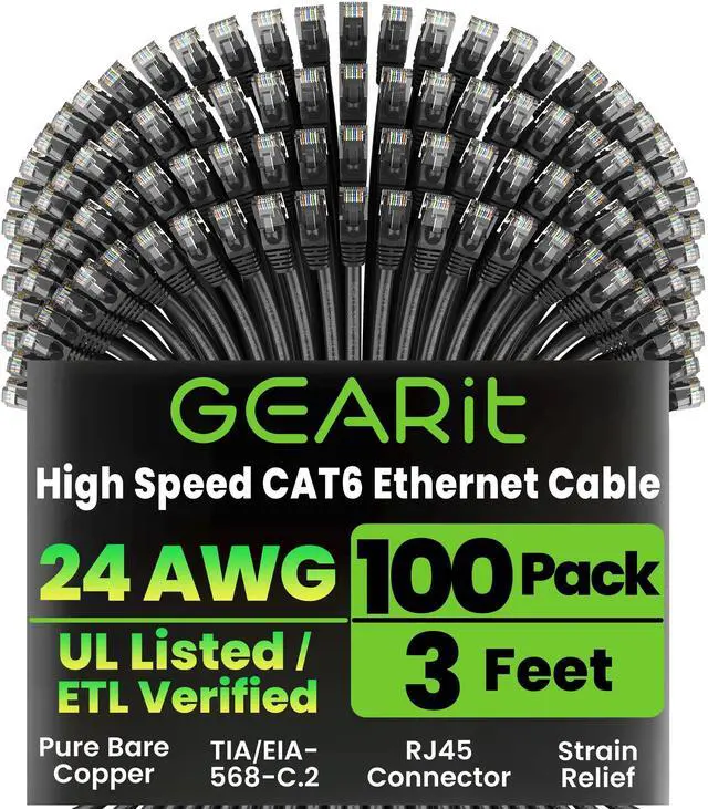 High-Performance Cat 6 Ethernet Cable Pack GEARit's 100-pack of 3 ft Cat6 ethernet patch cables features 24 AWG UTP stranded conductors twisted in an X-structure spline to minimize crosstalk and deliver full 10 Gbps bandwidth - future-proof network cables for home, office, data-center, and server use. ^^ Advanced Cat6 Technology Engineered to meet or exceed TIA/EIA-568-C. 2 standards, these Cat6 ethernet cables offer up to 550 MHz of throughput at a Cat5e price. Fully backwards compatible with Cat5/5e networks and ready for 10-Gigabit Ethernet applications. ^^ Reliable, Secure Wired Connection Say goodbye to Wi-Fi dropouts - this Cat 6 network cable (aka ethernet cable Cat 6 or RJ45 patch cable) provides rock-solid LAN connections for PCs, servers, routers, printers, gaming consoles, and more, ensuring low-latency, interference-free data transfer.