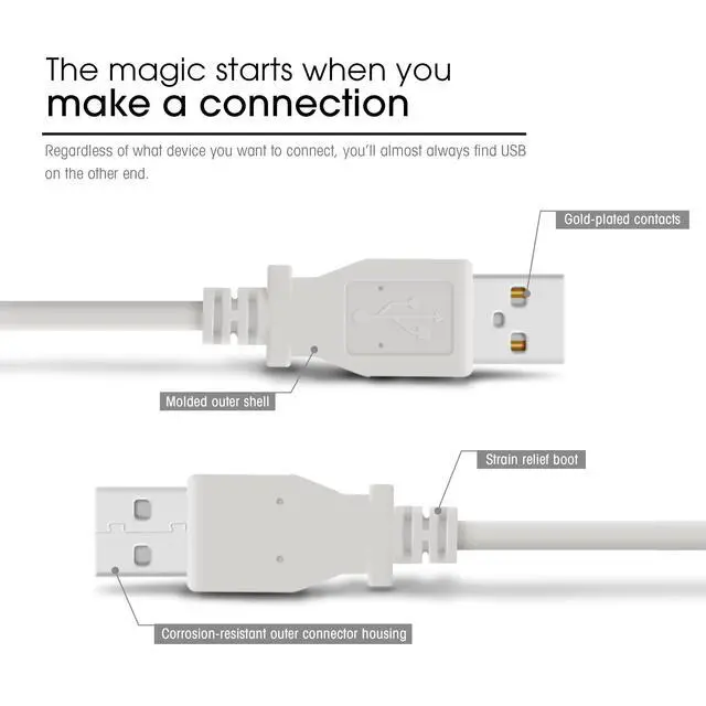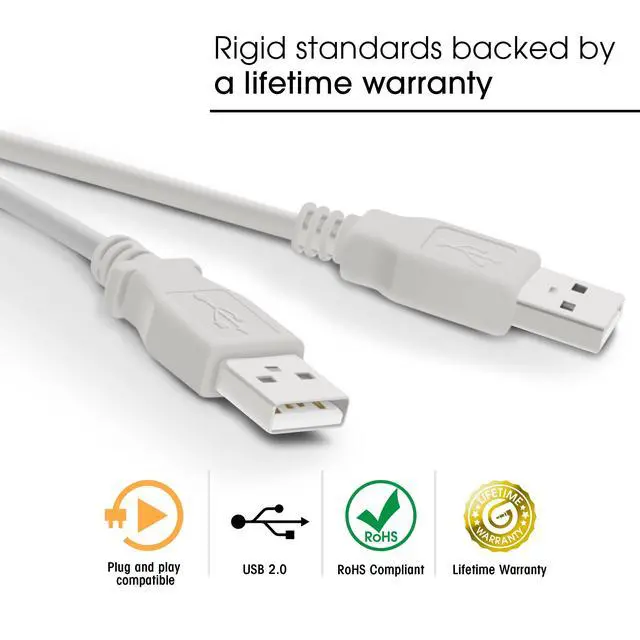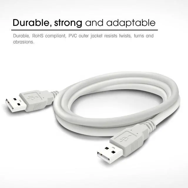 This is a standard male to male USB 2.0 cable with A-type connections on both ends. This is typically the style of connection found on the backs of PCs. USB 2.0 cables are backwards compatible as they can carry a USB 1.0 and 1.1 signal. USB cables are used to connect devices such as digital cameras, digital video cameras, scanners, printers, web cams, mice, keyboards, joysticks, network connections, etc.