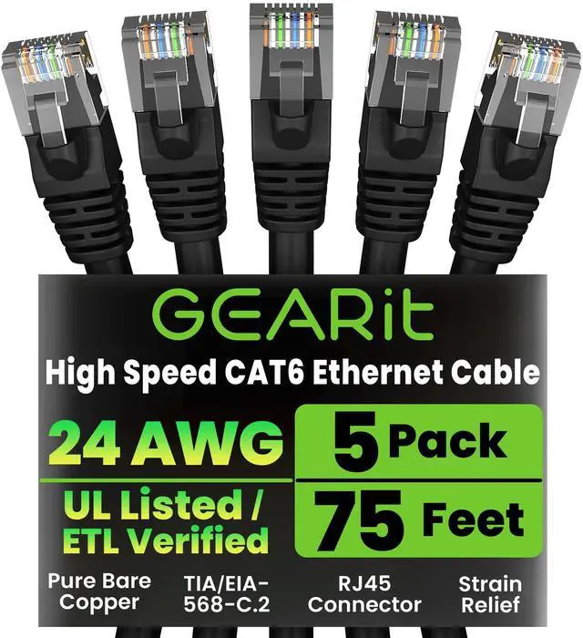 High-Performance Cat 6 Ethernet Cable Pack GEARit's 5-pack of 75 ft Cat6 ethernet patch cables features 24 AWG UTP stranded conductors twisted in an X-structure spline to minimize crosstalk and deliver full 10 Gbps bandwidth - future-proof network cables for home, office, data-center, and server use. ^^ Advanced Cat6 Technology Engineered to meet or exceed TIA/EIA-568-C. 2 standards, these Cat6 ethernet cables offer up to 550 MHz of throughput at a Cat5e price. Fully backwards compatible with Cat5/5e networks and ready for 10-Gigabit Ethernet applications. ^^ Reliable, Secure Wired Connection Say goodbye to Wi-Fi dropouts - this Cat 6 network cable (aka ethernet cable Cat 6 or RJ45 patch cable) provides rock-solid LAN connections for PCs, servers, routers, printers, gaming consoles, and more, ensuring low-latency, interference-free data transfer.