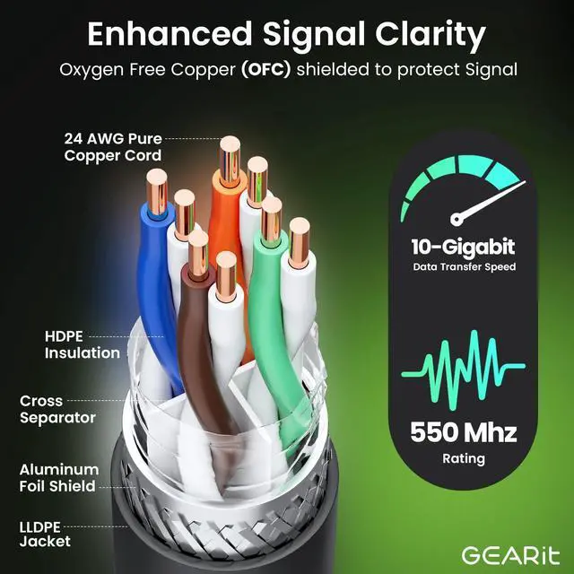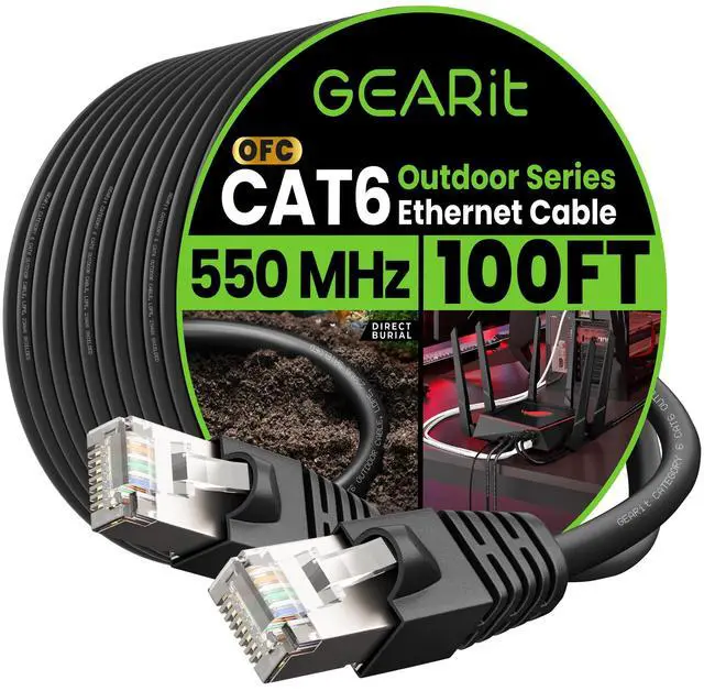 GEARit Cat6 Ethernet Cable for outdoors is a FTP -Foiled Twisted Pair network cable, perfect for direct burial, and it's UV/water resistant. Cat 6 Internet Cable protects your Internet signal from interference. It is rugged and flexible, so there is no need to pipping. This high speed cable reaches up to 10 Gbps and has a bandwidth of 550 MHz. You can connect the patch cable to any network device in your home or business. It also works with video game consoles such as PS4/PS5/Xbox One/Xbox 360. iled Twisted Pair network cable, perfect for direct burial, and it's UV/water resistant.