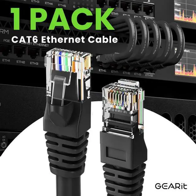 High-Performance Cat 6 Ethernet Cable Pack GEARit's 1-pack of 100 ft Cat6 ethernet patch cables features 24 AWG UTP stranded conductors twisted in an X-structure spline to minimize crosstalk and deliver full 10 Gbps bandwidth - future-proof network cables for home, office, data-center, and server use. ^^ Advanced Cat6 Technology Engineered to meet or exceed TIA/EIA-568-C. 2 standards, these Cat6 ethernet cables offer up to 550 MHz of throughput at a Cat5e price. Fully backwards compatible with Cat5/5e networks and ready for 10-Gigabit Ethernet applications. ^^ Reliable, Secure Wired Connection Say goodbye to Wi-Fi dropouts - this Cat 6 network cable (aka ethernet cable Cat 6 or RJ45 patch cable) provides rock-solid LAN connections for PCs, servers, routers, printers, gaming consoles, and more, ensuring low-latency, interference-free data transfer.