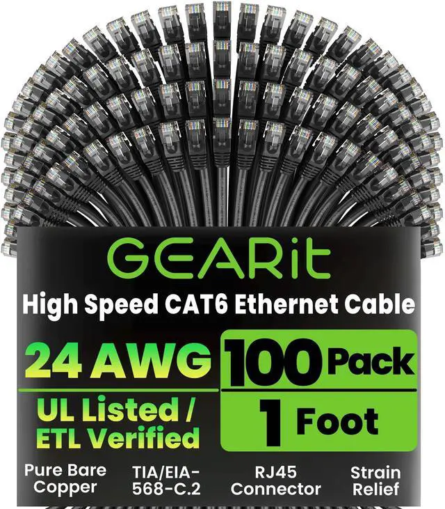 High-Performance Cat 6 Ethernet Cable Pack GEARit's 100-pack of 1 ft Cat6 ethernet patch cables features 24 AWG UTP stranded conductors twisted in an X-structure spline to minimize crosstalk and deliver full 10 Gbps bandwidth - future-proof network cables for home, office, data-center, and server use. ^^ Advanced Cat6 Technology Engineered to meet or exceed TIA/EIA-568-C. 2 standards, these Cat6 ethernet cables offer up to 550 MHz of throughput at a Cat5e price. Fully backwards compatible with Cat5/5e networks and ready for 10-Gigabit Ethernet applications. ^^ Reliable, Secure Wired Connection Say goodbye to Wi-Fi dropouts - this Cat 6 network cable (aka ethernet cable Cat 6 or RJ45 patch cable) provides rock-solid LAN connections for PCs, servers, routers, printers, gaming consoles, and more, ensuring low-latency, interference-free data transfer.