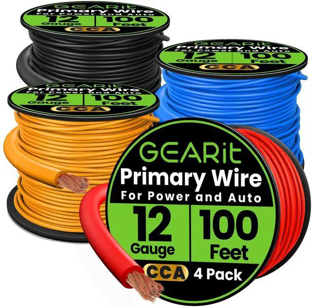 Gauge Wire Kit: Get 100 ft each of Black, Red, Blue, and Yellow (400 feet in total). GEARit 12 AWG CCA power wire set is the ultimate choice for automotive battery cables, car audio amplifier installs, and ground wiring, ensuring you have the right color for every polarity need. ^^ Premium CCA