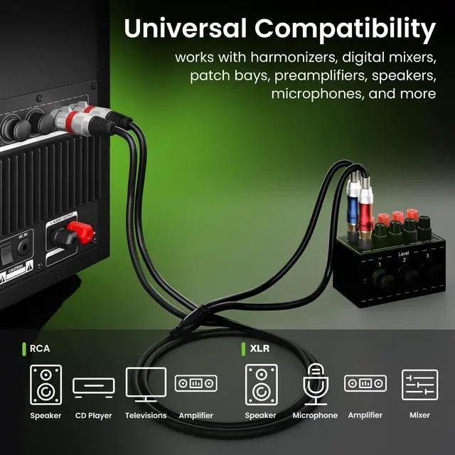 PROFESSIONAL QUALITY - OFC Oxygen Free Copper conductors for exceptional sound quality; Spiral braided copper shielding to reduce interference and insulate excess noise; Improved frequency through polyethylene insulation. ^^ UNIVERSAL COMPATIBILITY - This 3-pin XLR mic cord works with harmonizers, digital mixers, patch bays, preamplifiers, speakers, microphones, and more. ^^ SUPERIOR DESIGN - Heavy duty metal connectors with molded strain relief; Soft flexible PVC jacket with 6.0 mm outer diameter ^^ QUALITY YOU CAN HEAR - Connect the XLR audio port to AV receiver, amplifier, Hi Fi stereo audio system, home theater system, computer sound, recording equipment, speaker, TV, CD, DVD, mixing console, and more.