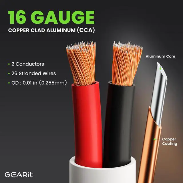 16 GAUGE IN WALL SPEAKER WIRE - GearIT Speaker Cable copper wires come in 2 conductor stranded copper wire designs. Suitable for in wall, in ceiling, attic, basement, and other office indoor home speaker setups. Suitable for 12V wire gauge (12 volt wire gauge), but max voltage of 30V. ^^ COPPER CLAD ALUMINUM WIRE (CCA) - Solid bulk speaker wires made of CCA are copper clad wire construction for high quality sound. GearIT CCA Speaker Cables provide true surround sound and high end audio sound wire experience without breaking your budget.