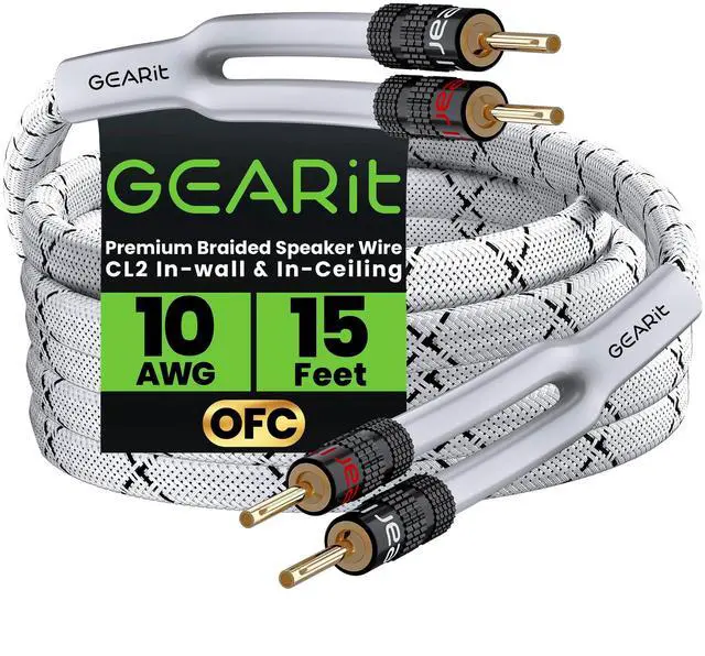 SPEAKER WIRE WITH BANANA PLUGS - Our GearIT 10AWG banana plug speaker wire is made from pure copper oxygen free speaker cable with speaker plugs. High quality and in wall CL2 rated premium banana plug wire designed for home stereo, center channel speakers, subwoofer, and sound systems. ^^ BRAIDED SPEAKER CABLE BANANA TIP - Our 10g high end terminated speaker wire with banana tips come with braided nylon jacket and color coding to distinguish polarity. Typically, a red banana tip is positive and white banana tip is negative ^^ DUAL BANANA WIRE SPEAKER PLUGS - The double banana plug tips for speaker wire are gold plated, corrosion resistant with premium high strand count for highest clarity, sound accuracy, and low signal distortion.