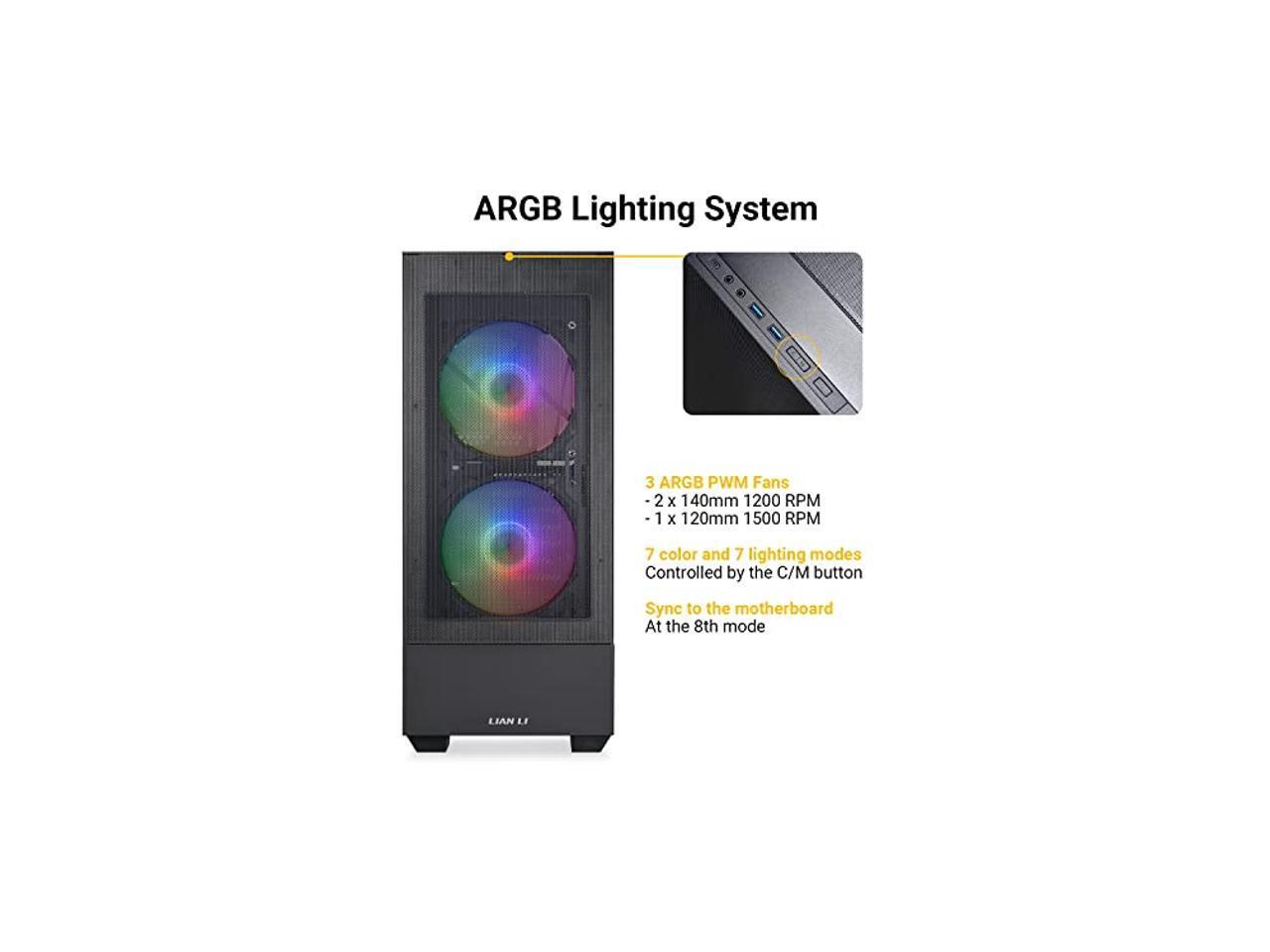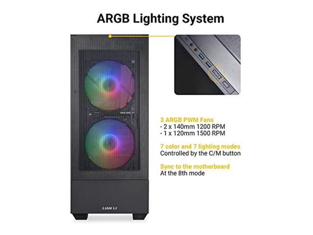 - Desktop computer case includes 3 ARGB LED Lighting PWM Fans - 2x140mm front fans and 1x120mm rear fan. 7 color and 7 lighting modes are controlled by the C/M button on the top of the case. Sync to the motherboard at the 8th Mode