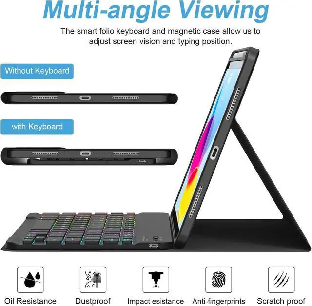[( Colorful Backlit Wireless Keyboard for iPad 10th Generation)] Optional Backlight mode make typing fun and easy in the dark, bring you different visual enjoyment and comfortable typing experience.you can turn your iPad into a highly performant and easy to use laptop!Like swipe and scroll to navigate iPad 10.9 even faster,that opens up new ways to work with your ipad. Delivering a comfortable user experience while allowing you