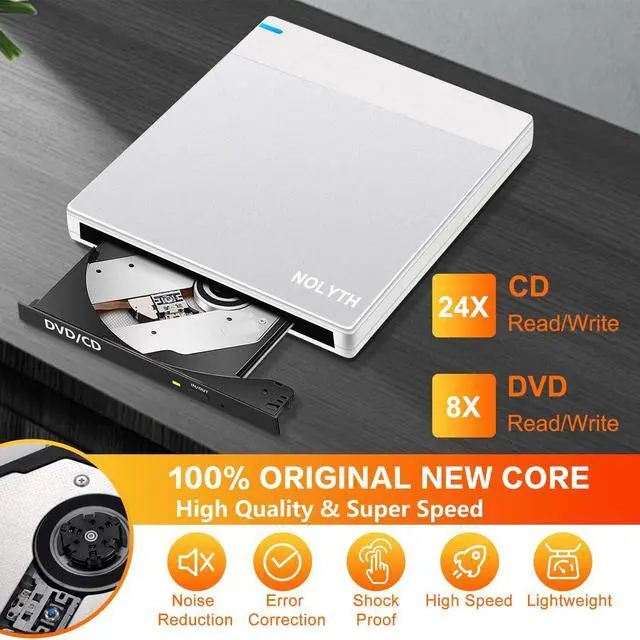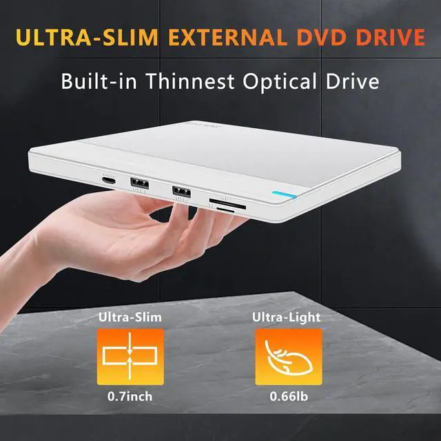 Ultra-thin and Lightweight: At just 0.7 inches thick and 0.66 pounds, the external CD/DVD drive for laptop is ultra-light and portable, you can easily carry this external DVD drive in your laptop bag wherever you go. Its brushed white case and silver aluminium top plate provide a stylish look