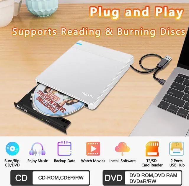 NOLYTH External CD/DVD Drive for Laptop, USB DVD Drive External, Ultra Thin CD Burner with SD/TF/2 USB Slots, Portable DVD Player CD Reader for Laptop PC Mac Desktop Computer Windows