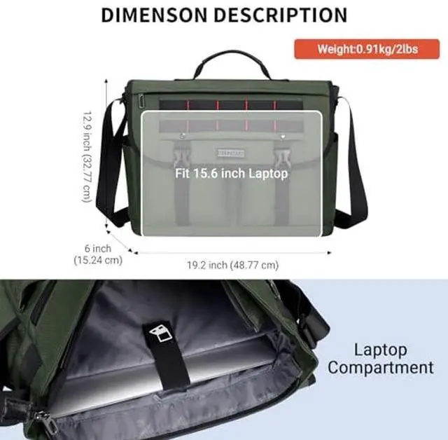 Material and Dimension:This messenger bag is made of high-quality nylon fabric and PU leather material.Polyester lining;Dimension:Approx 15.6"L x 12.9"H x 6" W(L: 39.62x H 32.77 xW 15.24 CM; Weight: 0.9kg (1.98 lbs).