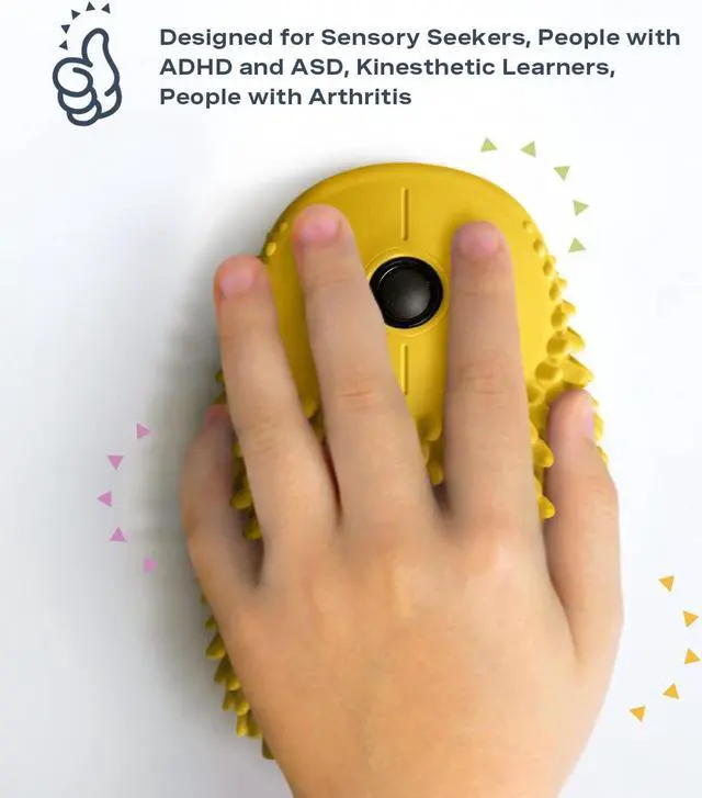 FIDGET TO FOCUS - A fidget gadget + computer mouse that is beneficial for sensory seekers, helping them to focus while working in front of a computer. The first ever mouse to bring together fun & functionality in one cool wireless mouse!