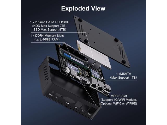 [(DDR4 RAM & Expandable )] This new design fanless industrial pc supports single SODIMM slot Max 16GB RAM. 1* Msata SSD + 1 x SATA3.0 for 2.5 inch HDD. Support DIY SSD, more fast performance storage. Size: 13.5*12.6*4.0cm ( 5.35*5.0*1.7 inches) Net weight 0.6KG. 12V 5A power supply. Super Mini but Powerful, ideal for industrial and commercial applications.