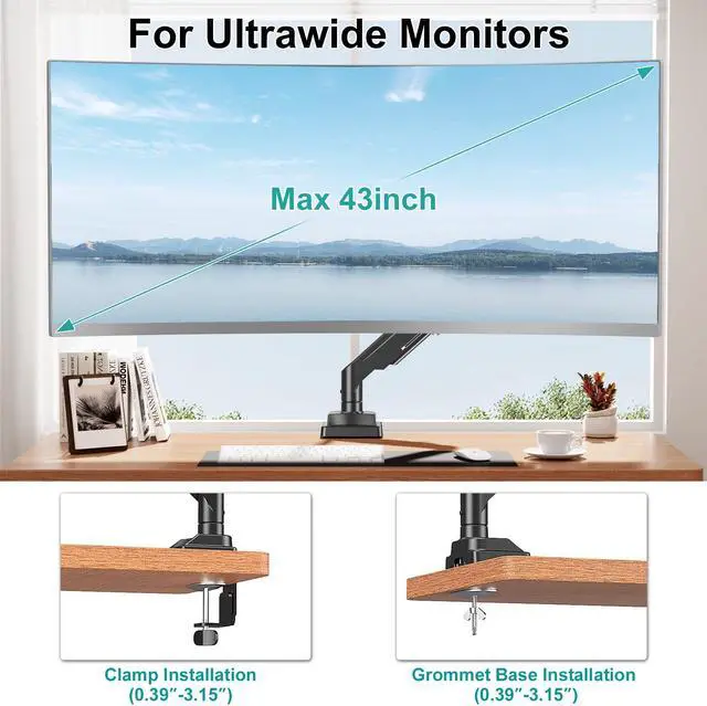 Ultrawide Monitor Mount - Our heavy duty monitor arm is engineered with sturdy construction and a premium gas spring, ensuring longevity while providing safety and stability for your setup. It is suitable for flat or curved screens ranging from 13" to 43", supporting monitor weights between 2.2 to 33.1 lbs with VESA patterns of 75x75 or 100x100mm. Compatible with brands such as Dell, Samsung, LG, Acer, ASUS, HP, MSI, Sceptre, etc., it includes but is not limited to monitors sized 43", 42", 39", 38", 35", 34", 32", 27", 24", 22" display.