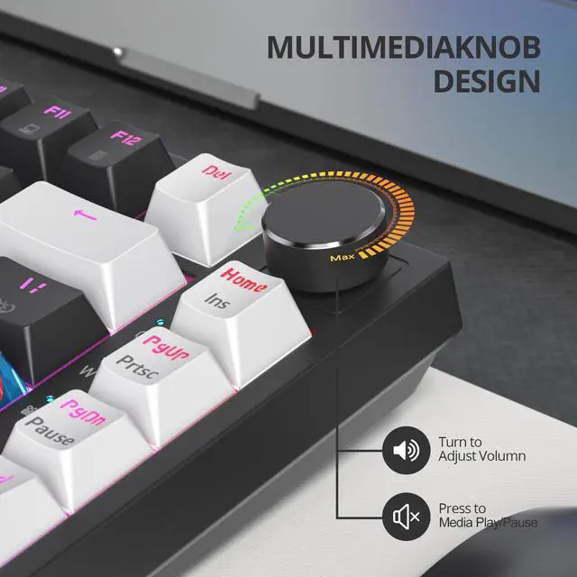 Keyboard with Volume Knob - The 82 keys compact gaming keyboard is equipped with a knob. You can adjust the volume of the device by rotating the knob, and press the knob to turn on/off the media videos. Quick access to volume control, media playback, allowing you to multitask effortlessly while gaming.