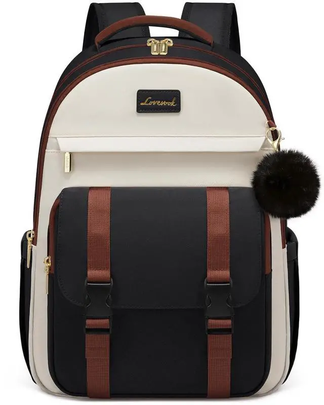 LOVEVOOK School Backpack for Teen Girls, Cute Student Backpack Purse Kid Bookbag for 14-16 Teenage, Back to School Backpacks Fit 15.6 Inch Laptop, Large College Travel Bag, Black-Beige-Brown