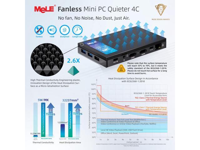 - [(Latest 12th Alder Lake N100)] MeLE Quieter4C micro pc is powered by faster 12th Alder Lake N100 processor (up to 3.4GHz), 4 cores, 4 threads, 6MB L3 Smart Cache with TDP 8W. N100 mini pc delivers more than 35% higher performance than N5105/N5095 CPU, with lower power consumption, and it can support 7/24 stable performance. Ideal for business, industrial, office, education and entertainment.