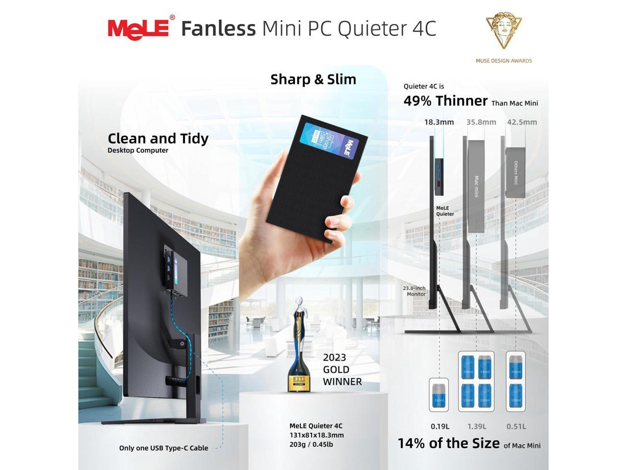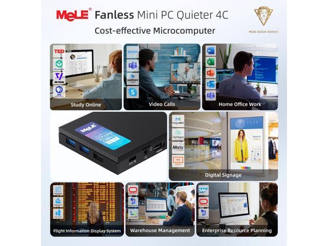 - [(Fanless Design & Ultra Small Size)] Mini desktop computer adopted fanless design of 0dB noise offers a silent and comfortable experience. Quieter4C small form factor pc in size only 5.2x3.2x0.7inch and 0.44Lb. This quiet pc can be easily carry out for a business trip. Space saving design comes with a VESA bracket, it can be mounted on the back of a TV/monitor. To improve the tidiness of office desk space. Good choice for light Office work, conference, web browsing, online education etc.