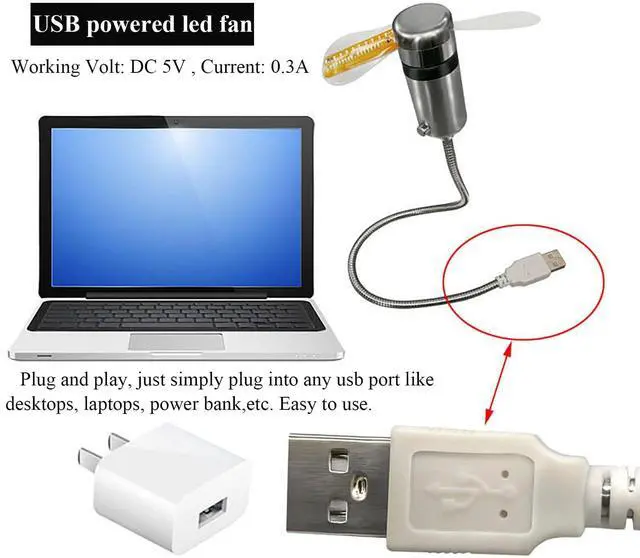 Usb powered led fan: Plug and play mini fan does not need to install any driver, just simply plug into any usb port like desktops, laptops, power bank, etc. easy to use ( Working Volt: DC 5V , Current: 0.3A)