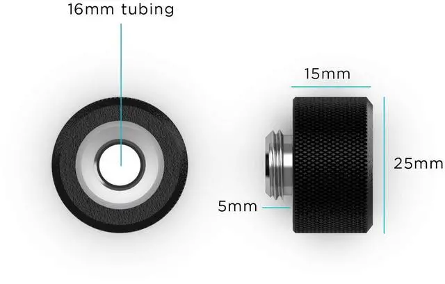 16mm OD Rigid PETG tubing 16mm OD Rigid PMMA tubing 16mm OD Rigid Copper tubing Included Parts 6x Coated cap 6x Nickel plated base 6x Bottom sealing o-ring 6x Tubing sleeve seal insert Installation No installation tool required. Finger tighten only. SX caps are coated with a durable powder coat, but we still recommend handling with care so you can enjoy the finish for years to come. If tools have to be used to loosen, make sure to cover them with a soft material to protect the finish.