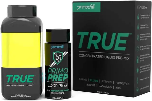 Mix Ratio: 1 gallon of DI Water**Deionized water (sold separately) offers low conductivity. Distilled is also acceptable, but will result in a more conductive fluid. Parts Included PrimoChill True - 8oz (makes 1 gallon of fluid) PrimoPrep - 2oz (makes 32oz+) Compatibility Do not mix ANY additional additives, fluids or silver coils, or different colors of True. This will change the formulation of True causing undesirable results, including sludging and breaking apart. The use of this product with aluminum components (such as aluminum constructed radiators) is STRONGLY DISCOURAGEDand will void the warranty. PrimoChill will not support or replace fluids used with an aluminum radiator FOR FILLING/PREP INSTRUCTIONS AND FULL COMPATIBILITYPLEASE VISIT MANUFACTURER'S WEBSITE Not responsible for any hardware damage. Use it at your own risk.