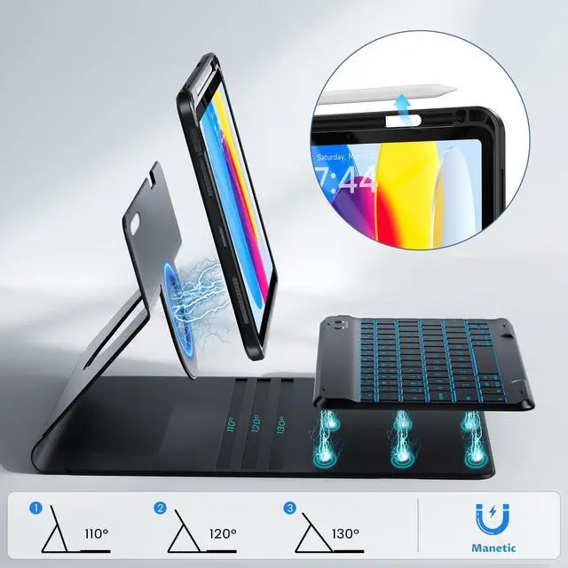 [(Upgraded Magnetic Shell and Three-Grooves Design Case)] The upgraded shell of the iPad 10th generation Keyboard Case can be individually adsorbed on any metal, thus improving the usage scenarios and making it perfect for studying, working, reading or watching videos. Also features 3 grooves for adjustable viewing angle and stable positioning.
