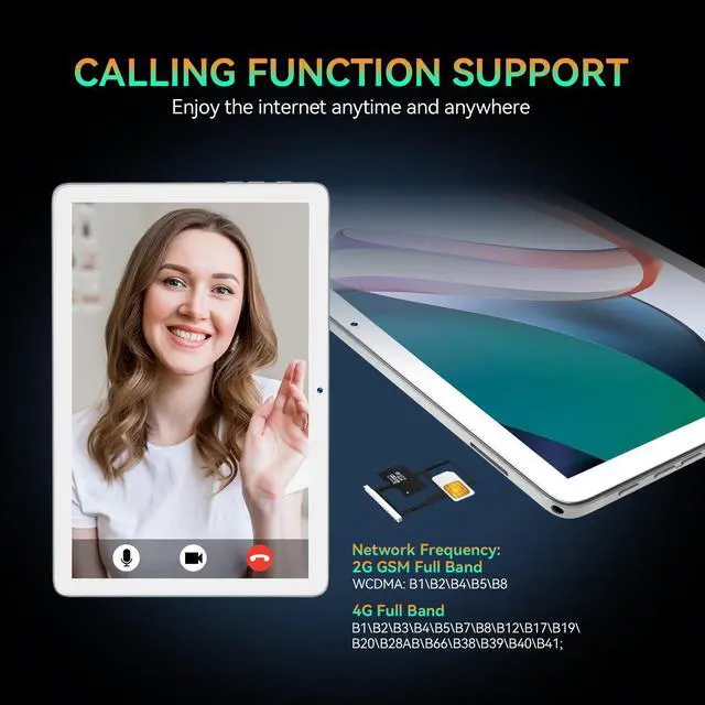 [(4G LTE ALL NETWORK)] The phone tablet has a call function and supports the full frequency band of 4G signals. There is no need to worry about SIM card compatibility issues or no network available when holding the portable tablet outdoors. If the SIM card is inserted and there is sufficient signal but the cellular feature doesn't work (make phone call, text, browsing Internet, etc.), please check the SIM Card activation status and the cellular balance. *NOTE: SIM CARD NOT INCLUDED