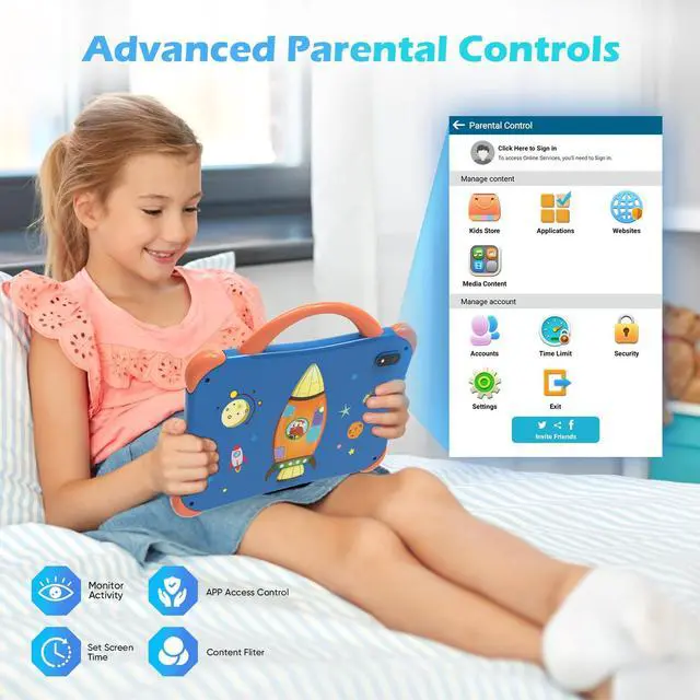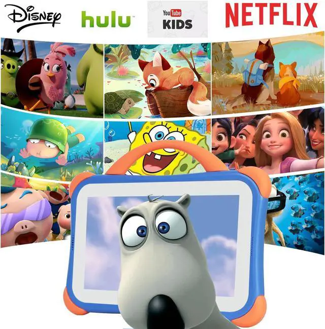 [(Multi Age-appropriate Contents)] Our 7 inch android kids tablet comes with plenty of kids learning apps,which give kids access to thousands of free apps, games, videos, E-books. These contents can stimulate kids' imagination, creativity and self-confidence. With our tablet kids will immersed in the oce