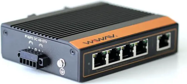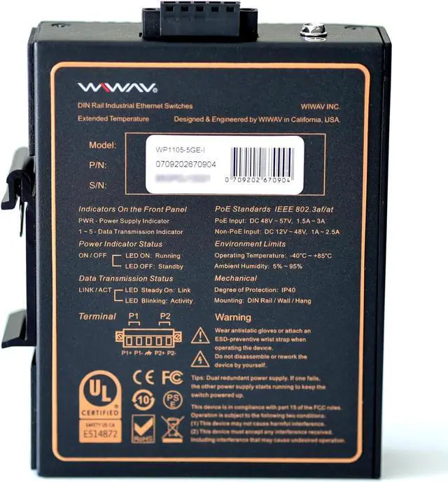 WIWAV WP1105-5GE-I 10/100/1000Mbps Unmanaged 5-Port PoE Gigabit Industrial Ethernet Switches with DIN Rail/Wall-Mount (UL Listed, IP40, -40 to 85)