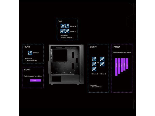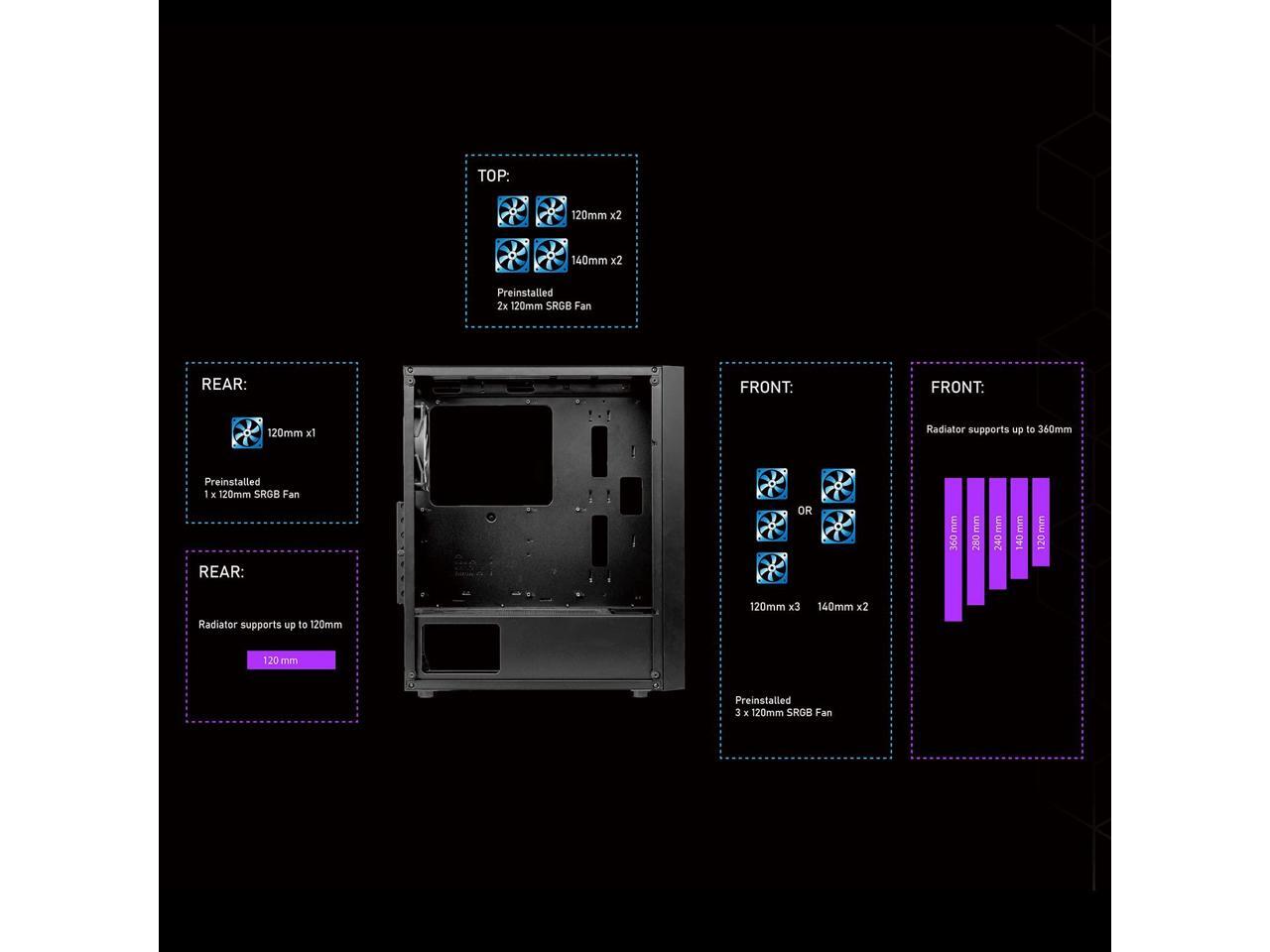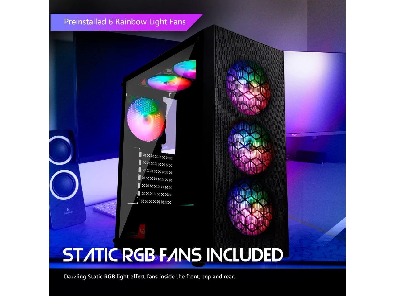 - Preinstalled 6 Fans. 6x 120mm Static RGB Color fans. 3 in the front, 2 on the top, and 1 in the rear.