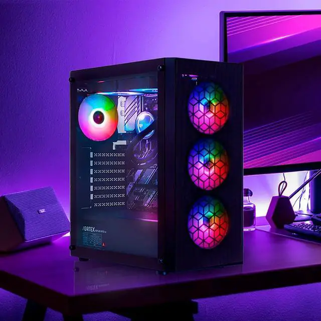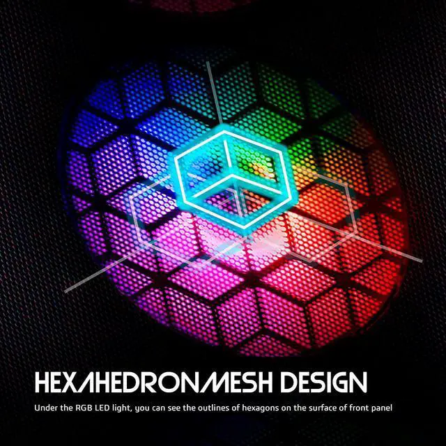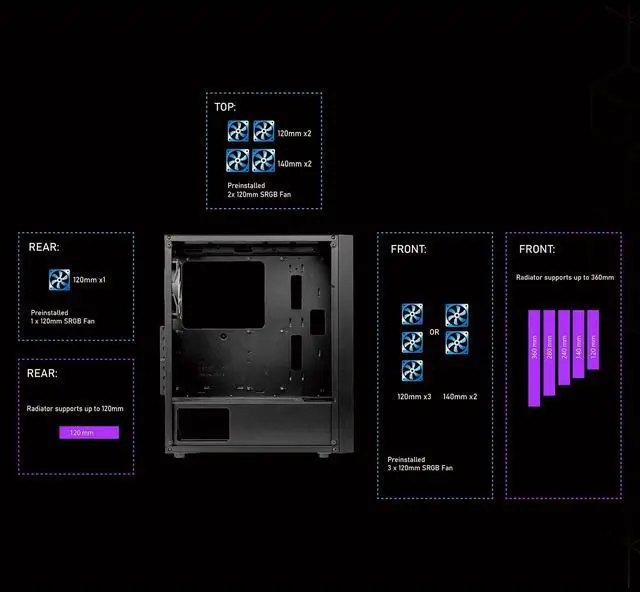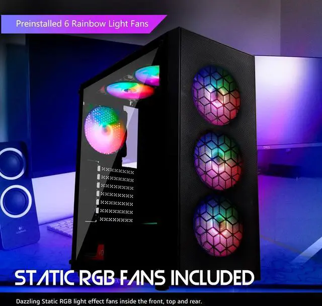 Preinstalled 6 Fans. 6x 120mm Static RGB Color fans. 3 in the front, 2 on the top, and 1 in the rear. ^^ Front panel with metal mesh grill and honeycomb design. Provide the maximum airflow and the superb light effect. ^^ The Computer Case with full size tempered glass offer you the best light effect and monitor the components. ^^ Magnetic dust filter on the top, easy to remove and clean. Keep the air circulation have the heat bringing out. ^^ The mid tower pc case provides multiple hard drive fixed slots, supporting to install 2*SSD + 2*HDD ^^ This case support graphic card up to 320mm fit the most graphic card in the market