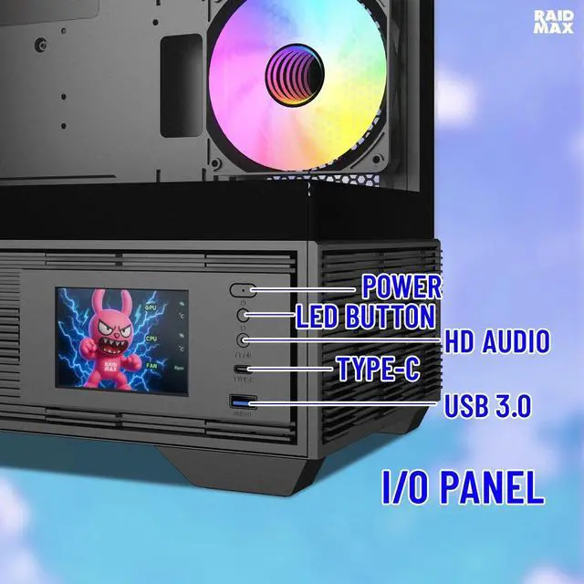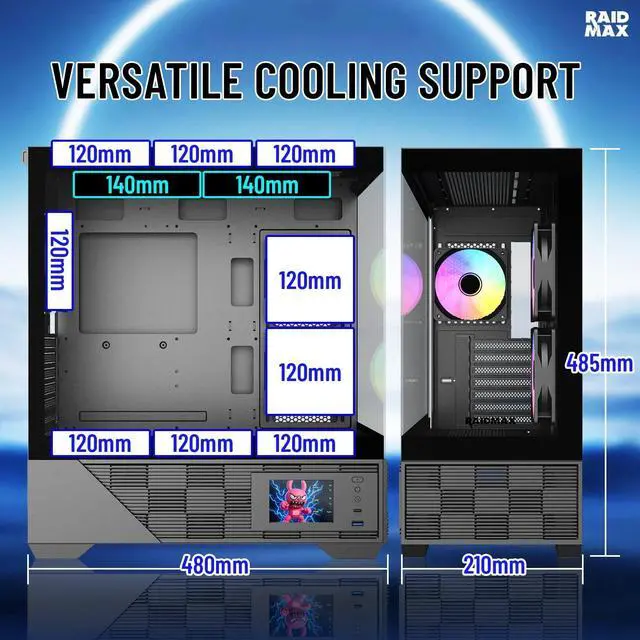 Built-In LCD Smart Display Customizable front screen shows real-time system monitoring, animated logos, or personalized content. ^^ Pre-Installed ARGB Fans Includes addressable RGB fans with vivid lighting and motherboard sync support via 5V 3-pin headers. ^^ Supports 360mm Liquid Cooling Front and top radiator support provides flexibility for high-performance thermal setups. ^^ Premium Panoramic Design Dual tempered glass side and front panels deliver a full 270 view of your build with immersive aesthetics. ^^ Next-Gen Ready Interior Fits GPUs up to 400mm, ATX / Micro-ATX / Mini-ITX boards, and supports tall tower CPU air coolers.