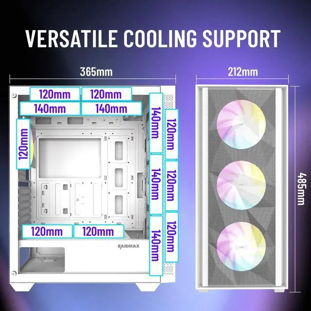 Mesh Front Panel for Maximum Airflow Full metal mesh design enhances intake efficiency, improving GPU and CPU cooling performance. ^^ 4x ARGB Fans Pre-Installed Three front intake and one rear exhaust ARGB fan offer vivid lighting and optimized airflow with motherboard sync support. ^^ Tempered Glass Side Panel Showcase your components and RGB lighting with a full-sized clear panel. ^^ Spacious Mid Tower Layout Supports up to 305mm GPU length, ATX / Micro-ATX / Mini-ITX motherboards, and up to 240mm front radiators. ^^ ARGB Lighting Made Easy Compatible with 5V 3-pin ARGB headers for synchronized lighting across your build.