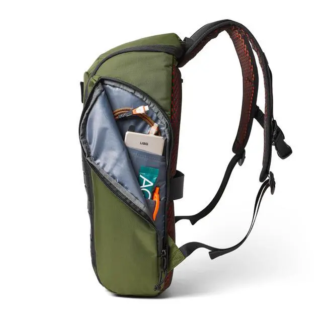 ^^ Travel Ready: Pass-through to securely attach to rolling luggage. A sternum strap to help prevent the shoulder straps from slipping off your shoulders and to disperse the weight more evenly across the upper body. Nylon stitched loops for gear attachment. Concealed tracker pocket inside main compartment for AirTag or similar tracker for added security. Hook & loop patch logo.