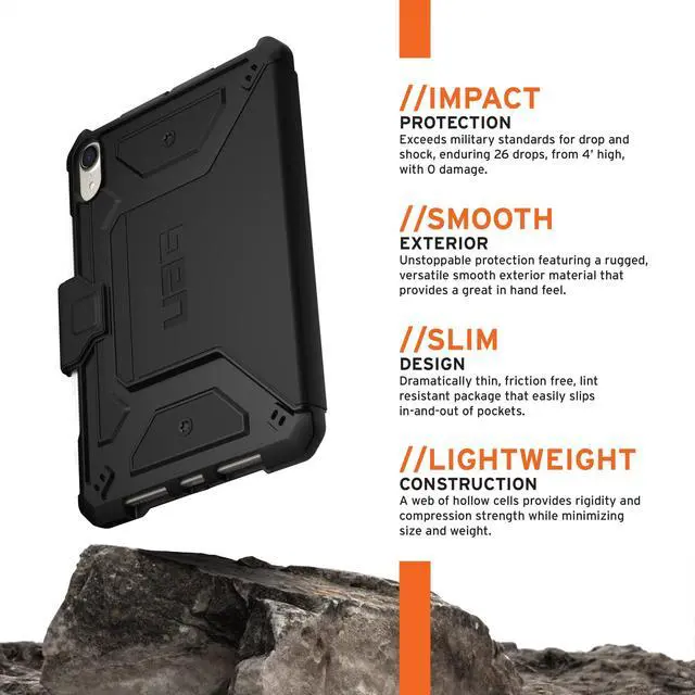 360-degree unstoppable protection featuring a rugged, versatile smooth exterior with a satin finish. ^^ Featuring an auto wake/sleep folio cover that doubles as an adjustable stand and a built-in Apple Pencil holder. Compatible with Apple Pencil Pairing/Charging. ^^ Featherlight composite construction with impact-resistant soft core ^^ Oversized tactile buttons and easy access to buttons and ports. Soft-raised screen surround bezel to protect screen and lens. ^^ Meets military drop test standards (MIL STD 810G 516.6 ).