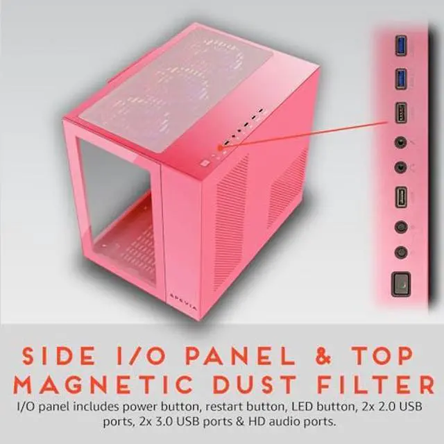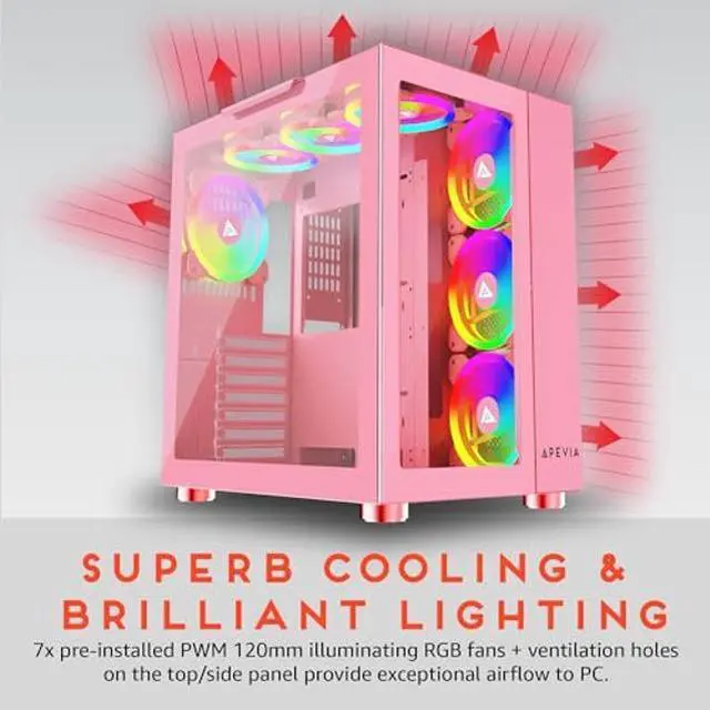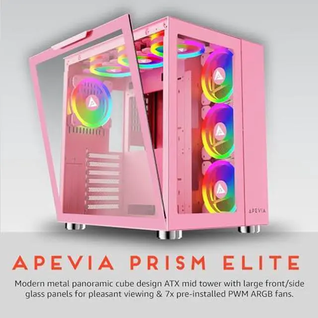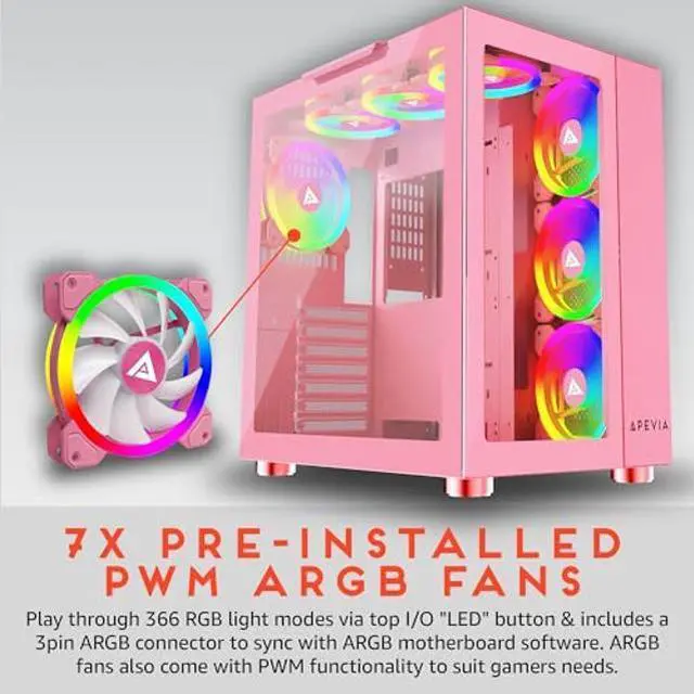 Apevia Prism-Elite-PK Prism Elite Mid Tower ATX Gaming PC Cube Case w/ 7X 120mm PWM ARGB Fans, 366 RGB Modes, Dual Tempered Glass Panels, 360mm Radiator Support, 2X USB 3.0, 2X USB 2.0, Pink